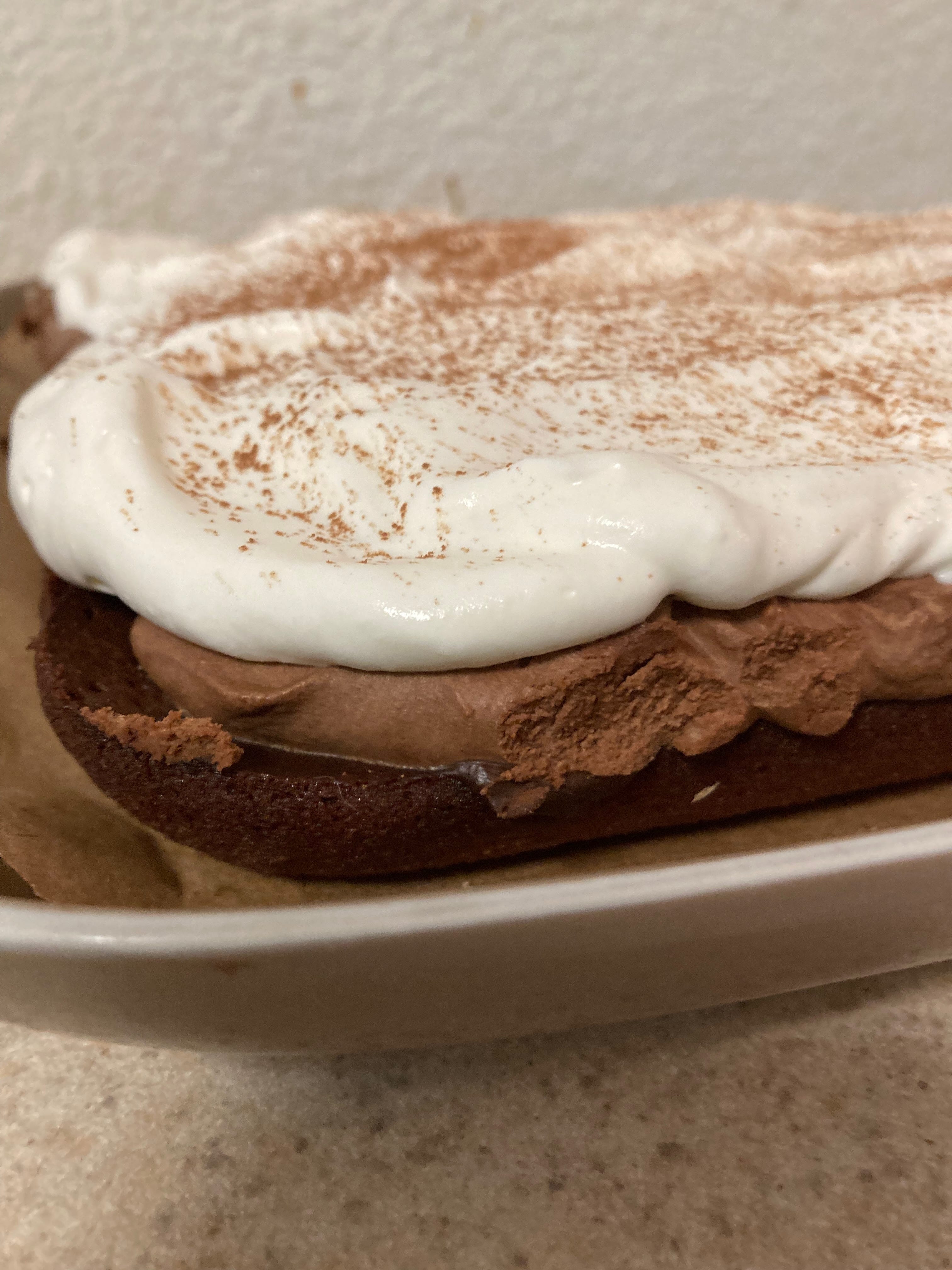 While the cake cooled, I made the soak (so the cake wouldn't be dry), made the ganache and put it in the fridge. When the ganache was cool, I made the chocolate mousse. After the cake was room temperature, I applied the soak, then a thin layer of ganache, and the thick layer of chocolate mousse. Back in the fridge overnight. The next morning, I whipped the cream, applied it to the cake, and dusted the top of the cake with cocoa.