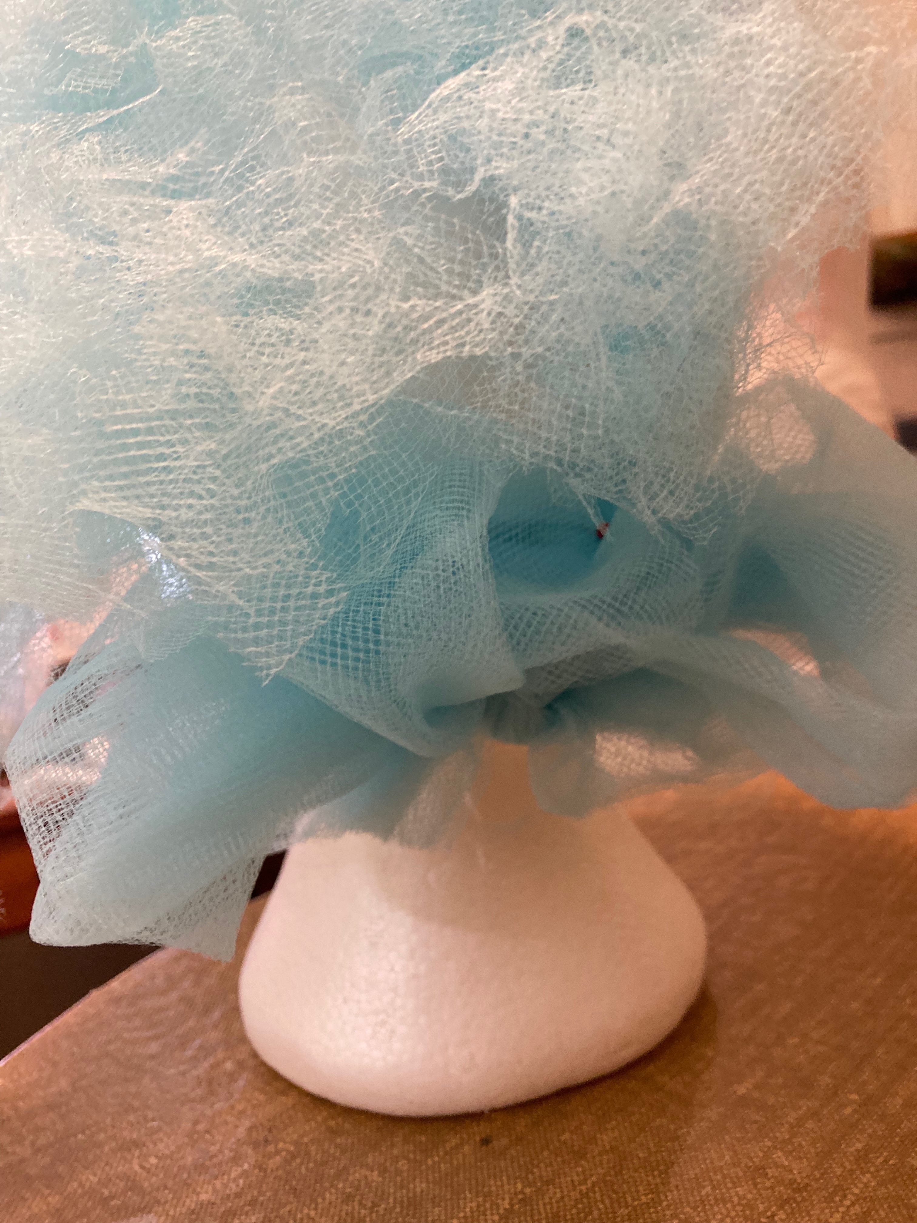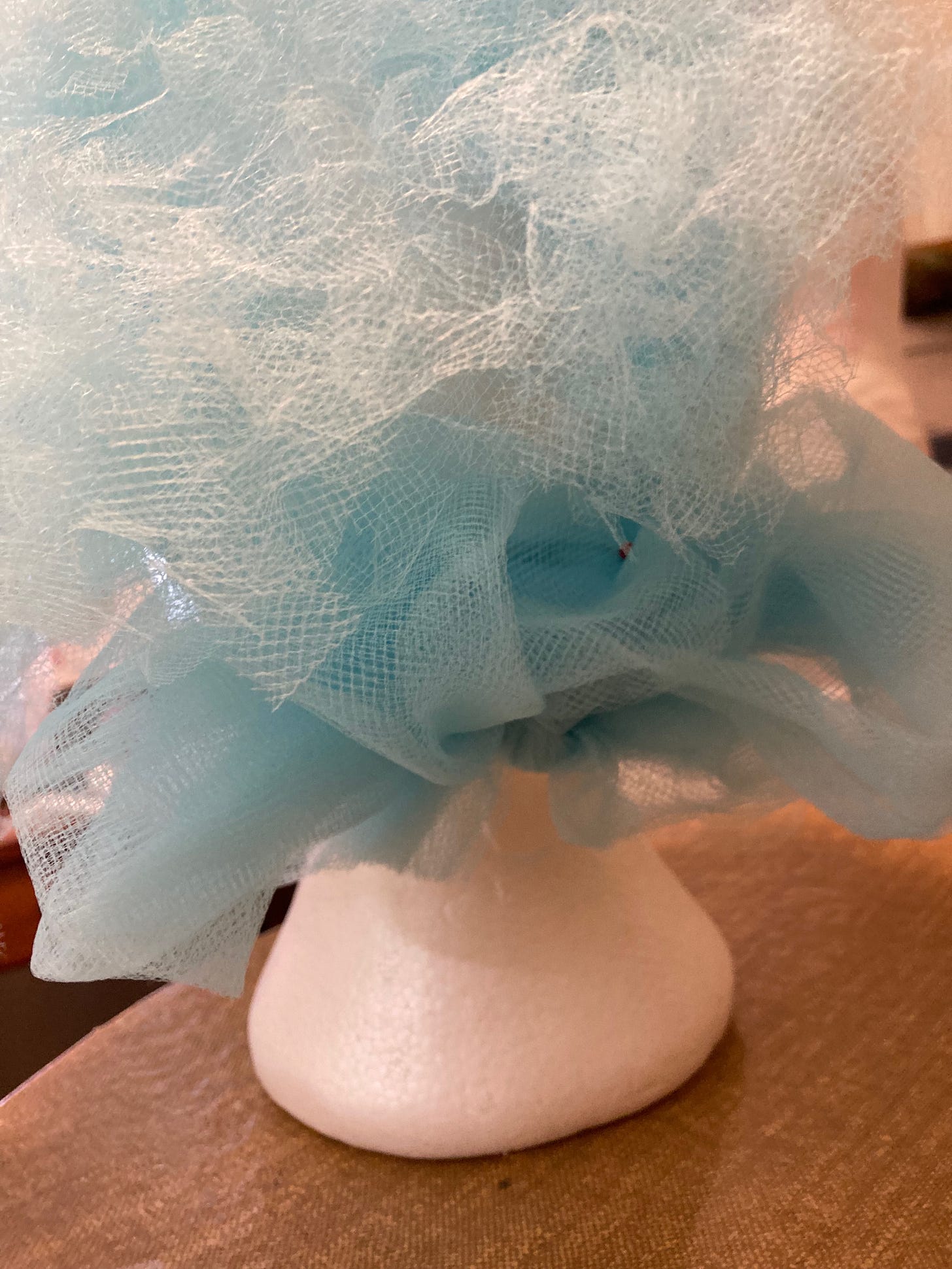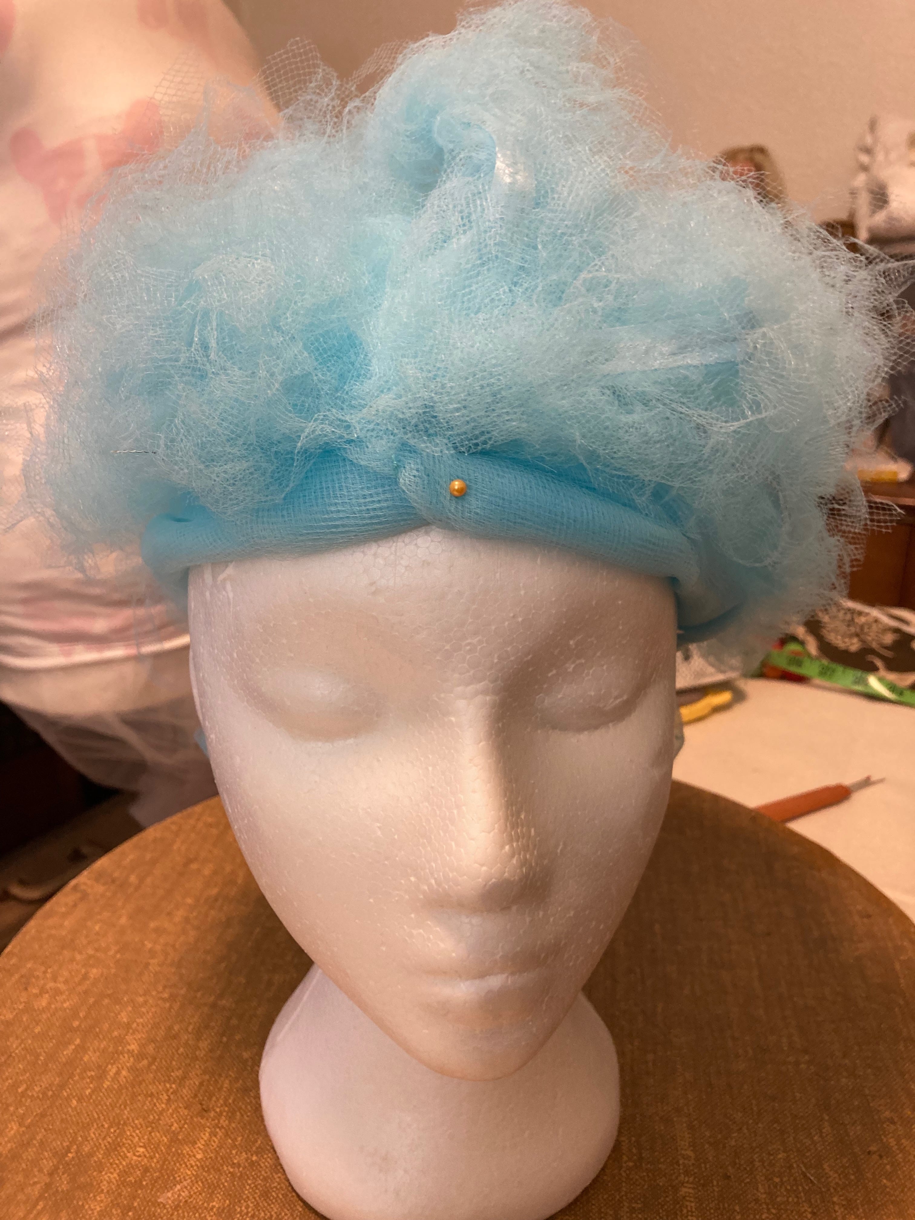 Last year, or maybe the year before I made myself a fancy hat. I wore it Saturday night to a concert. I made the entire thing from turquoise tulle I had originally bought to cover a gardening bed. What was left over from covering the planted seeds became a hat. I created "feathers" from the tulle and a bit of ribbon. I twisted a length to go around my head and tie in a big bow. I attached the feathers by hand. When I made the hat, it was to go with a costume I created to do to a play dressed as Mrs. Peacock from Clue. Apparently I didn't take pictures of the hat or the costume at the time. Anyway, it was great fun to wear it then, and to wear it again last night
