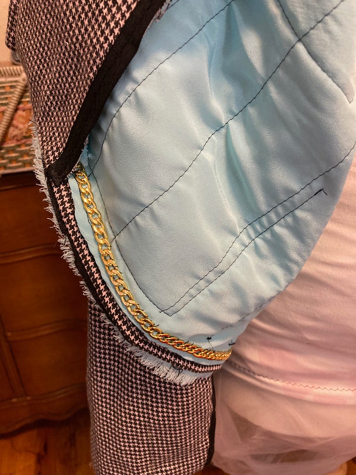 I quilted the lining, hand sewed the lining seams, created and added sleeve heads, added trim, and the Chanel finishing touch: gold chain at the bottom of the jacket to hold its shape.